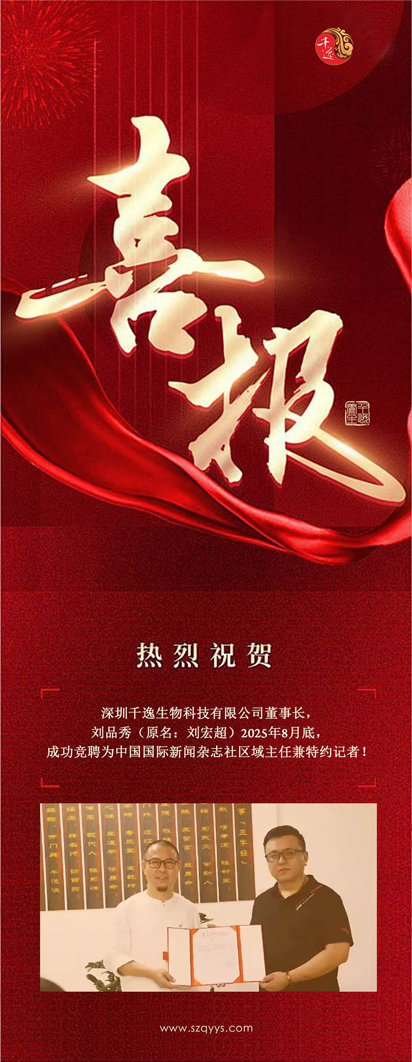 深圳千逸生物科技有限公司董事长,刘品秀(原名:刘宏超)2025年8月底,成功竞聘为中国国际新闻杂志社区域主任兼特约记者!